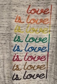 I invite us all to think about that this Pride month I have a t shirt. I’m not generally inclined to be so informal as to wear one in church, but I brought it to show you today. Here goes…….. It says, Love is love is love is love is love is love! or as they say in the south, Y’all means all. Amen.